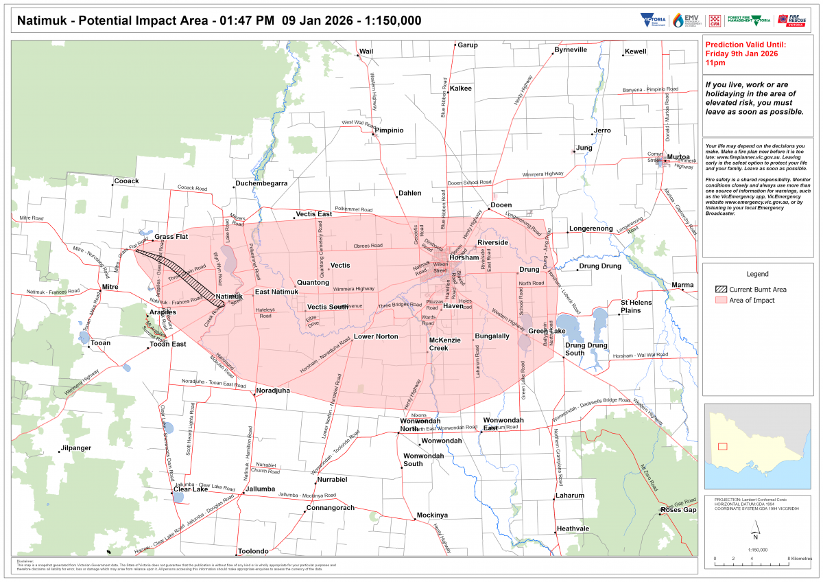 The attached map shows the potential impact area of the Natimuk fire. People in this area should first check VicEmergency for current warnings. If you are not under an Emergency Warning - Take Shelter Now, you must activate your bushfire survival plan and leave immediately ahead of predicted worsening conditions. Leaving early is always the safest option to protect your life. Check warnings regularly as the situation changes.