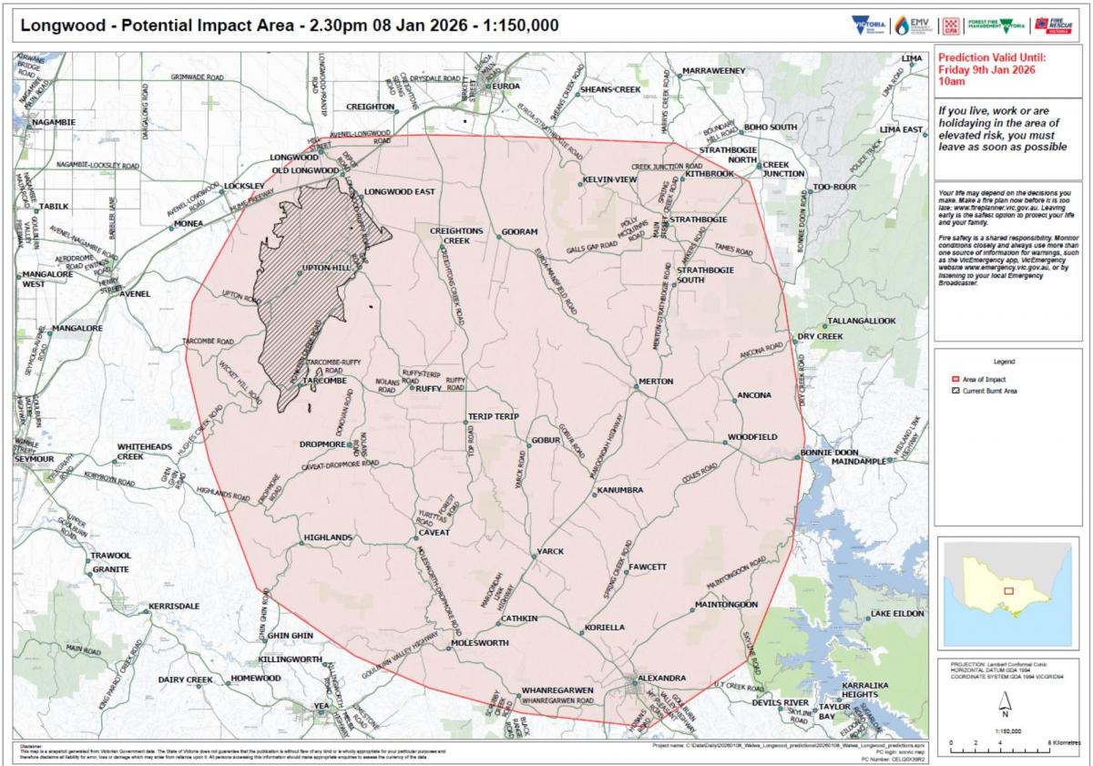 The fires shown in these maps are currently burning in the grey area displayed. Emergency services are concerned about conditions forecast for Friday 9 January 2026 and the potential for the fires to spread significantly.