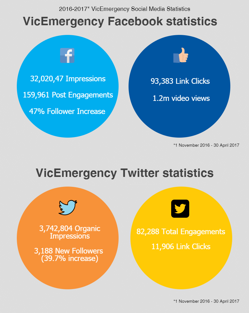 The VicEmergency Facebook and Twitter accounts have grown to provide emergency information to Victorian communities through automated and curated warnings, video content, specialised graphics and imagery, to ensure communities across Victoria have the access to timely, tailored and relevant information so they can make informed decisions about their safety before, during and after an emergency.